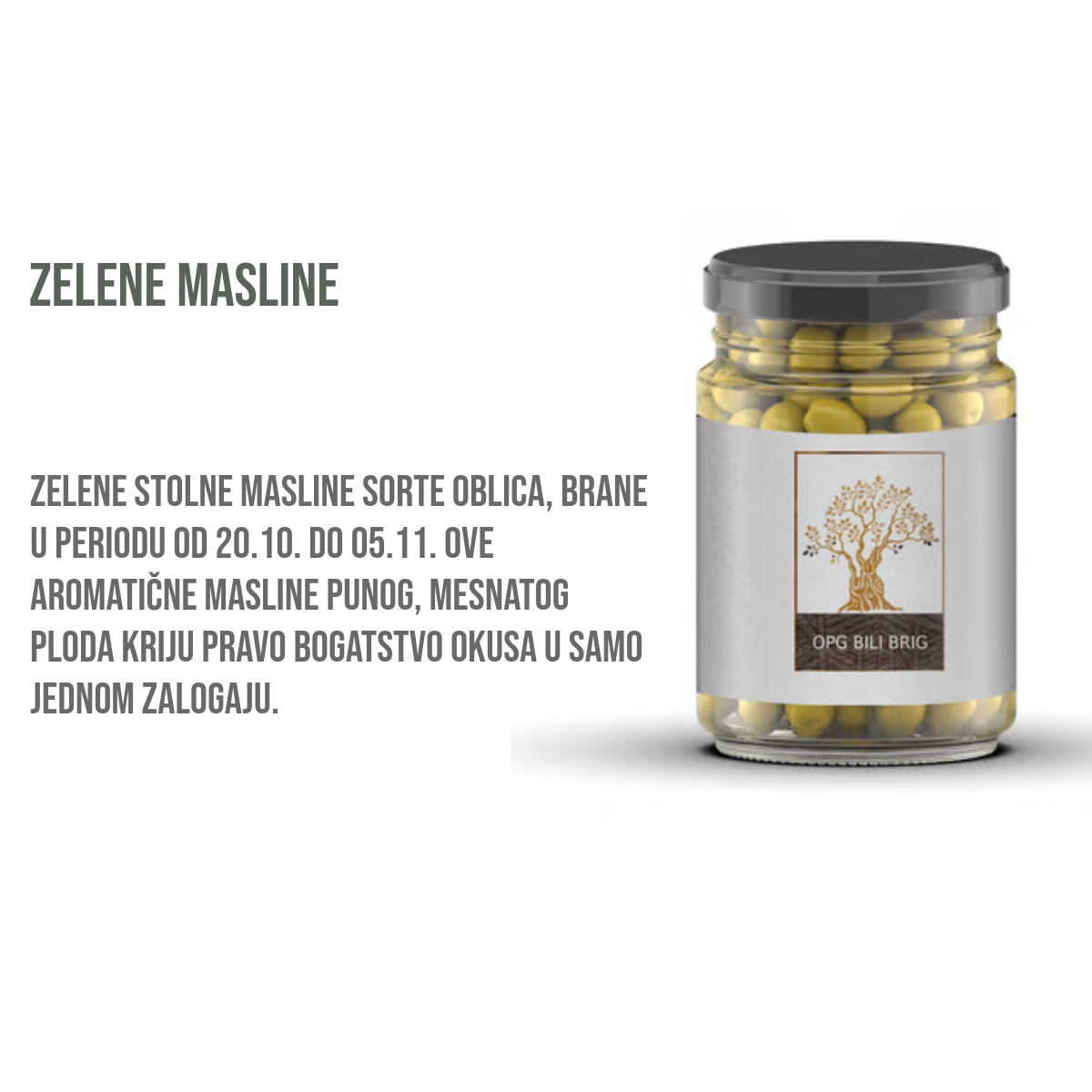 Najviše zastupljena je sorta Oblica te dodatno talijanske sorte; Leccino, Pendolino i Ascolana tenera kao i manji broj stabala Krvavice, autohtone sorte skradinskog područja.