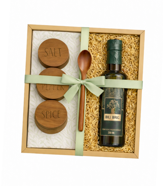 POKLON PAKET#1 : tri drvene posudice za začine te drvena žličica i jedna 0.25L boca STANDARD ulja.